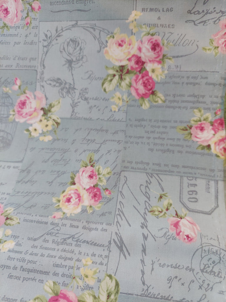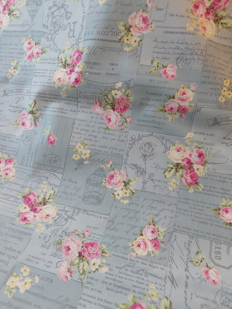 RuRu Bouquet cotton fabric by Quilt Gate Ru2420-12B Pink Roses and French Script on Blue